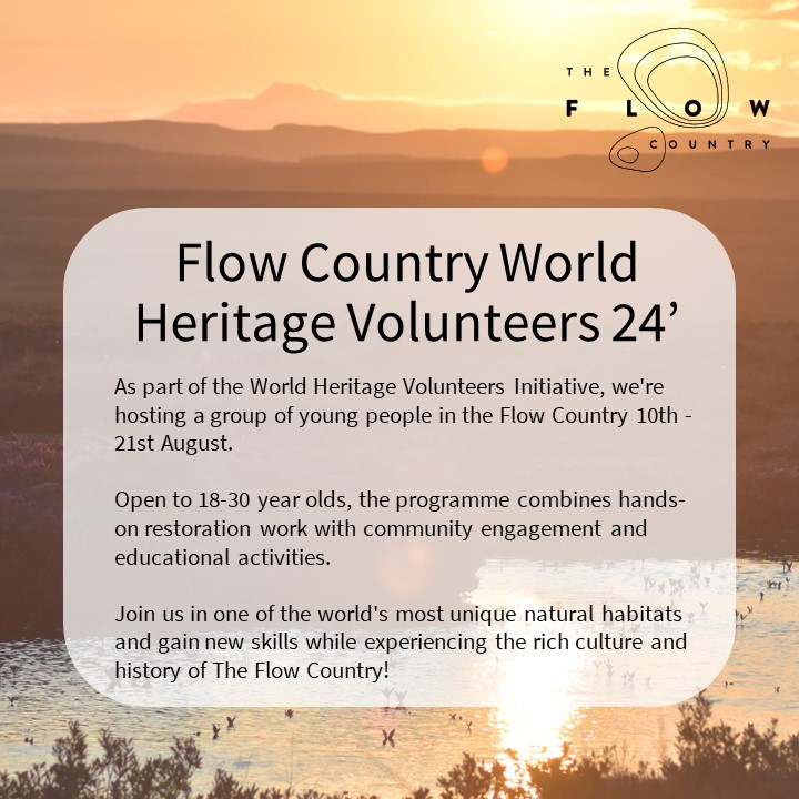 From the 10th – 21st August 2024, we’re hosting a group of young people age 18-30 years old at the Flows Field Centre based at Forsinard as part of the World Heritage Volunteers Programme. This programme aims to introduce young people from various backgrounds to The Flow Country peatlands, offering educational opportunities for international volunteers and raising awareness on both local and national stages.